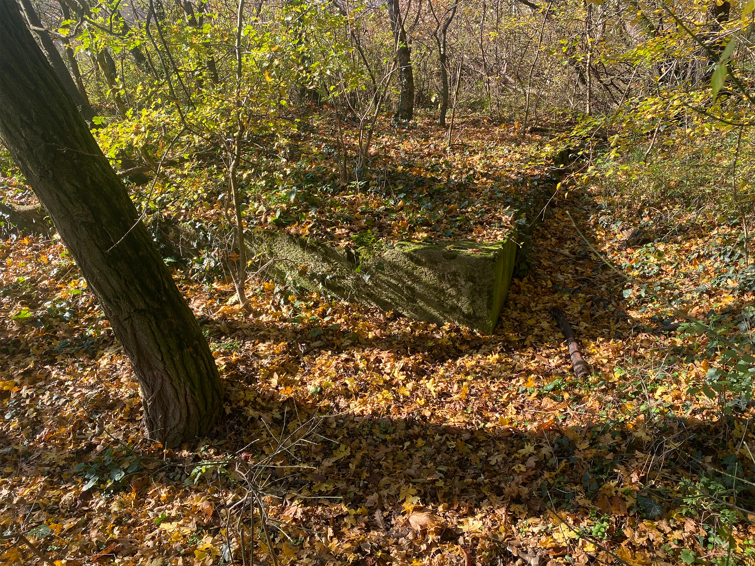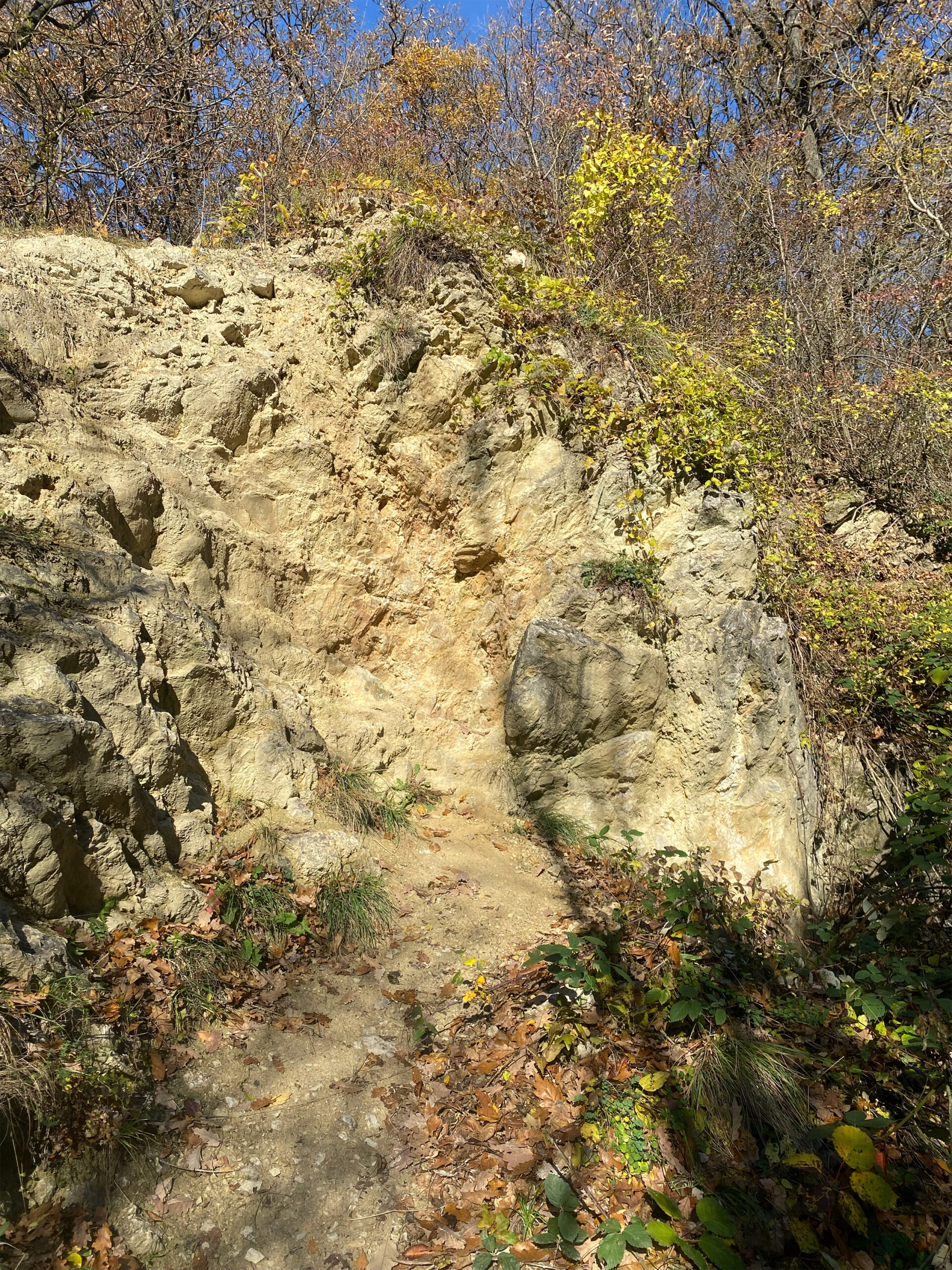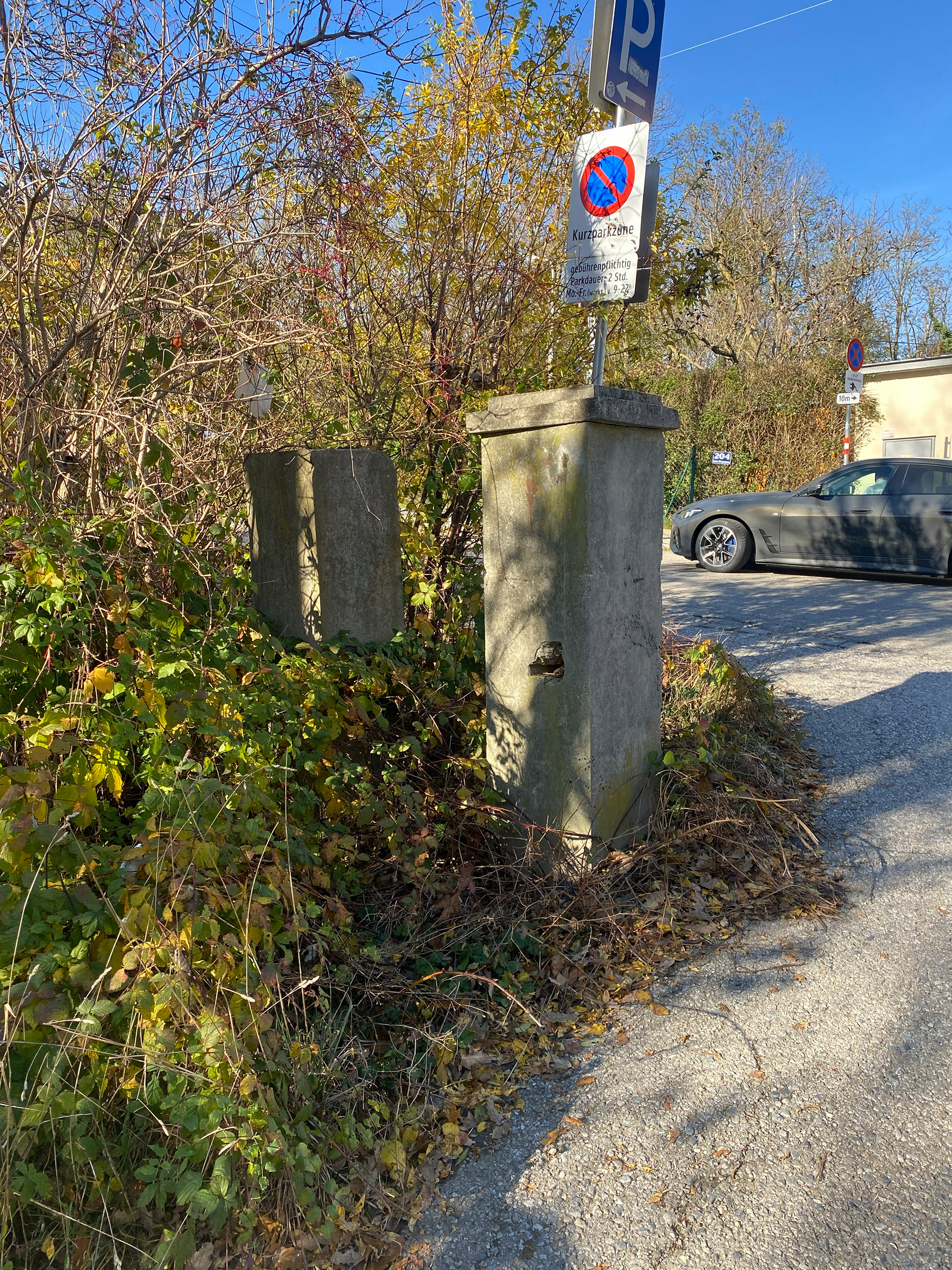 Folgt man dem Weg bis zum Parkplatz – heute begrünt und durch aufgeschüttete Schwellen strukturiert – und hält sich beim Biotop links, führt der Weg entlang des Weingartens. Hier sind noch Mauerreste von Flakstellungen zu erkennen, die sich einst über den ganzen Hang Richtung Rodaun erstreckten. So wandert man in wenigen Schrit­ten von Zeug­nissen eines 12 Millionen Jahre alten Meeres zu Spuren des Zweiten Weltkriegs, der erst vor 80 Jahren en­dete.