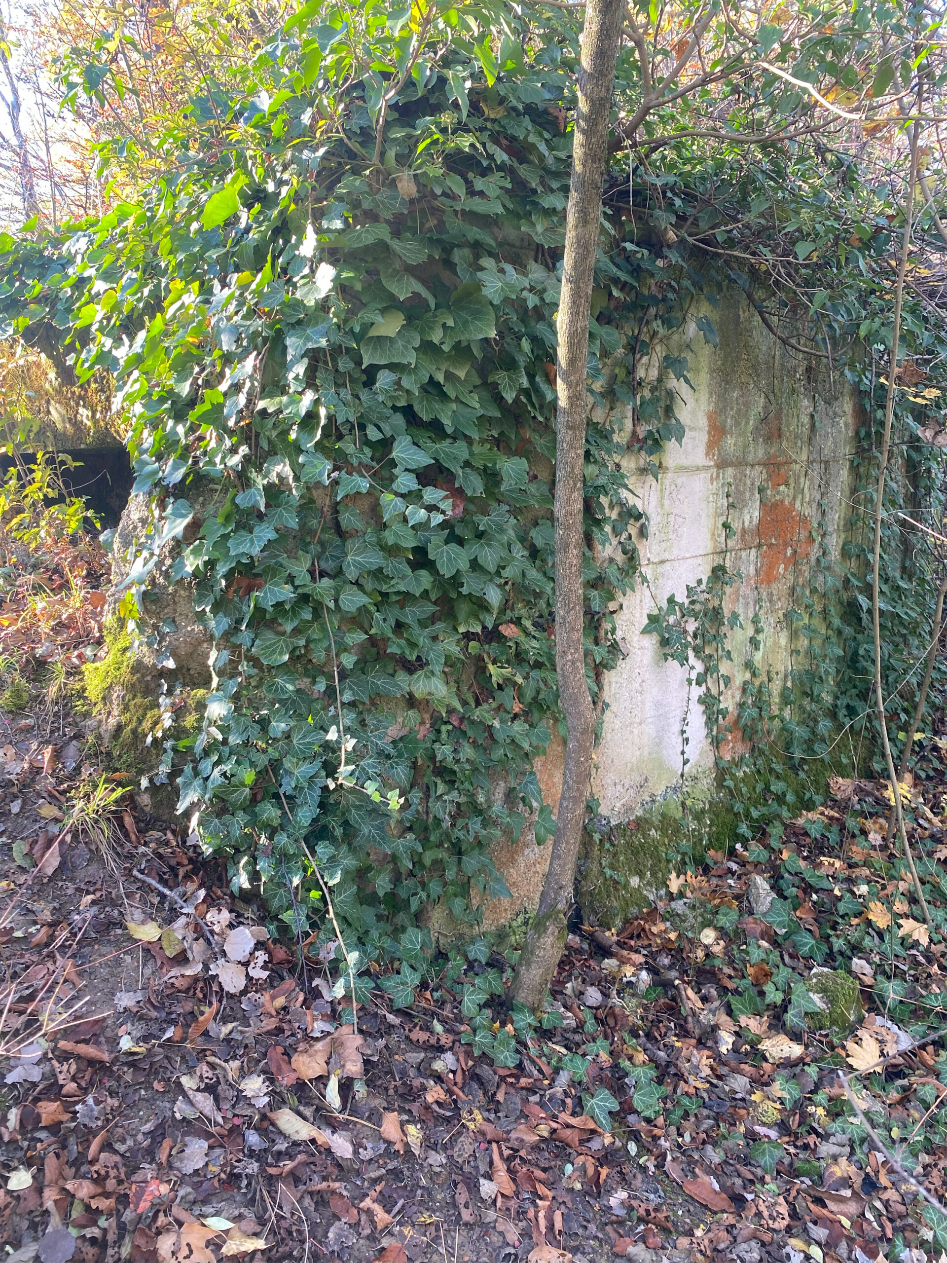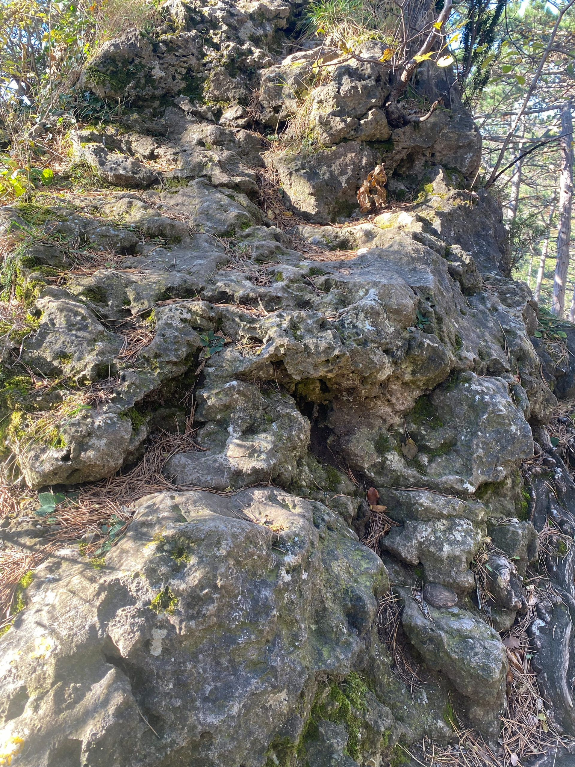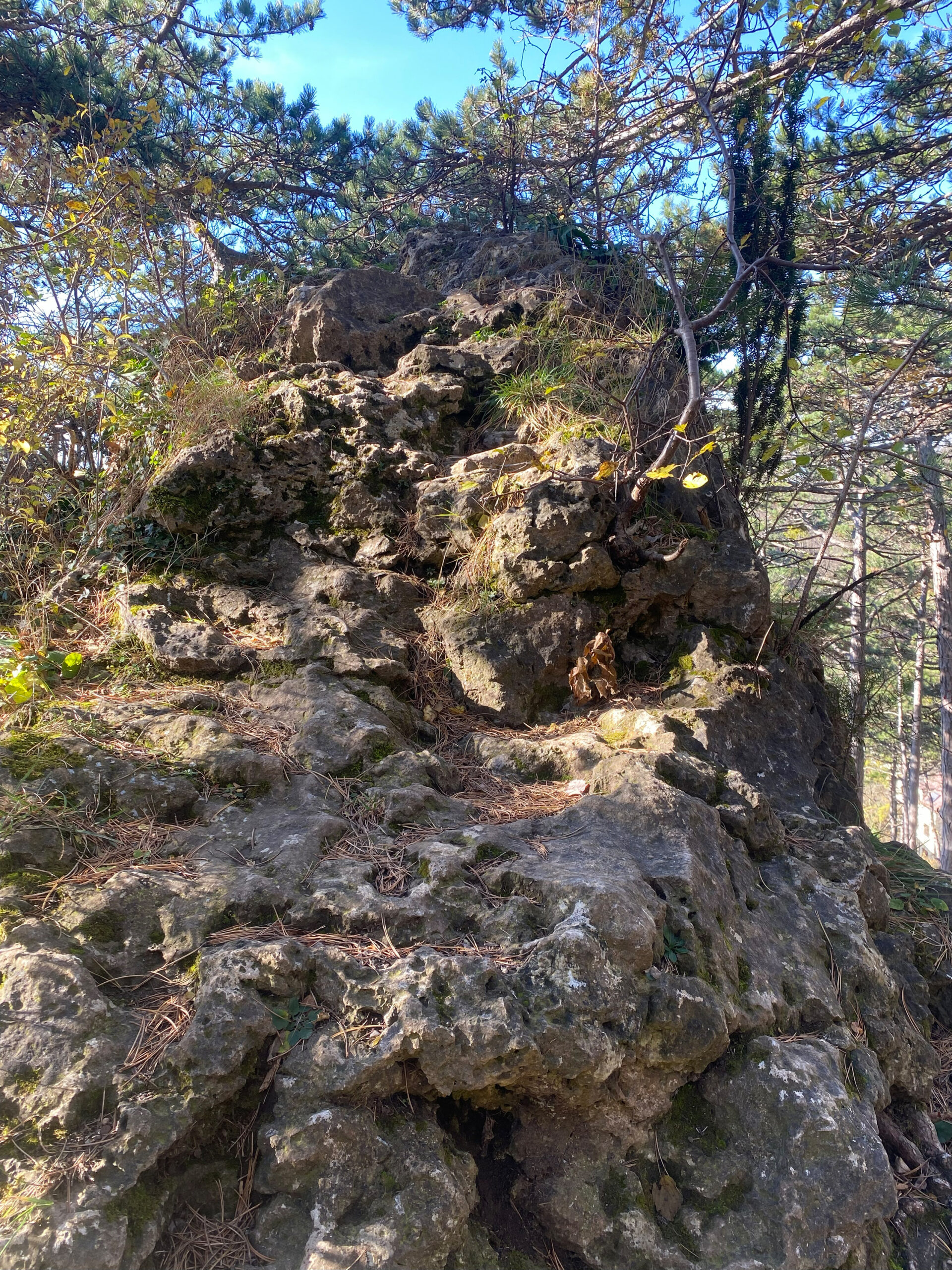 Folgt man dem Weg bis zum Parkplatz – heute begrünt und durch aufgeschüttete Schwellen strukturiert – und hält sich beim Biotop links, führt der Weg entlang des Weingartens. Hier sind noch Mauerreste von Flakstellungen zu erkennen, die sich einst über den ganzen Hang Richtung Rodaun erstreckten. So wandert man in wenigen Schrit­ten von Zeug­nissen eines 12 Millionen Jahre alten Meeres zu Spuren des Zweiten Weltkriegs, der erst vor 80 Jahren en­dete.