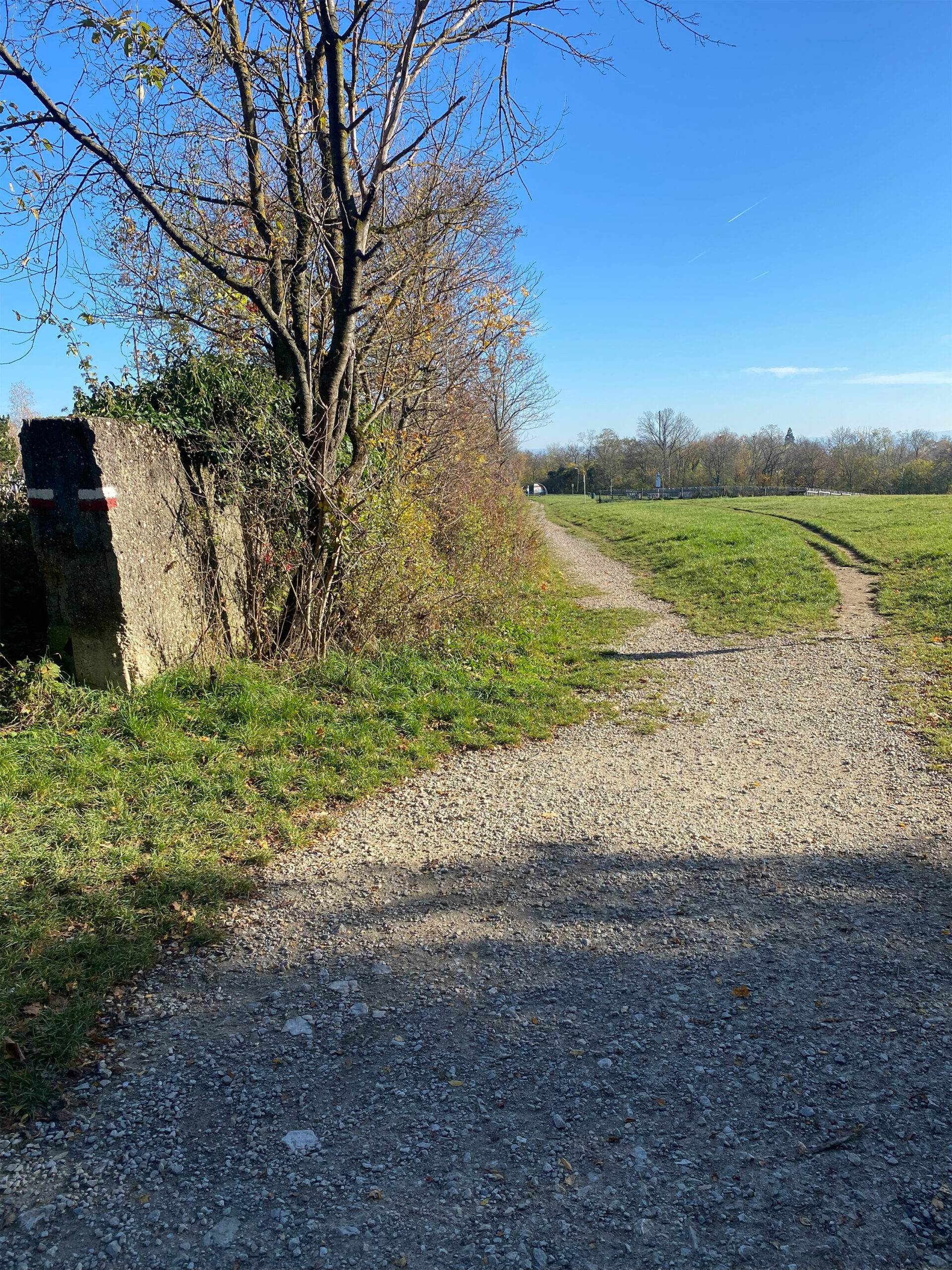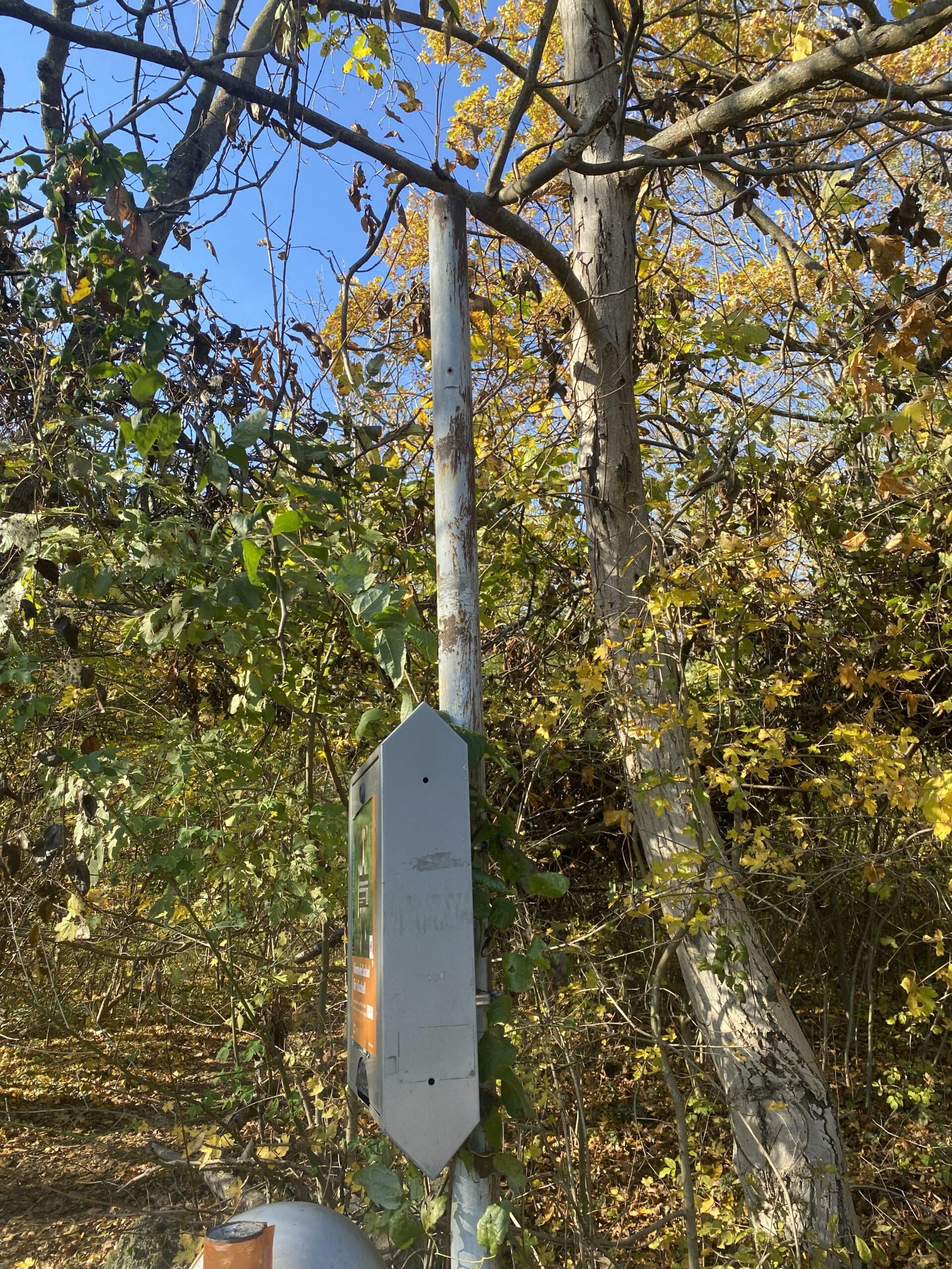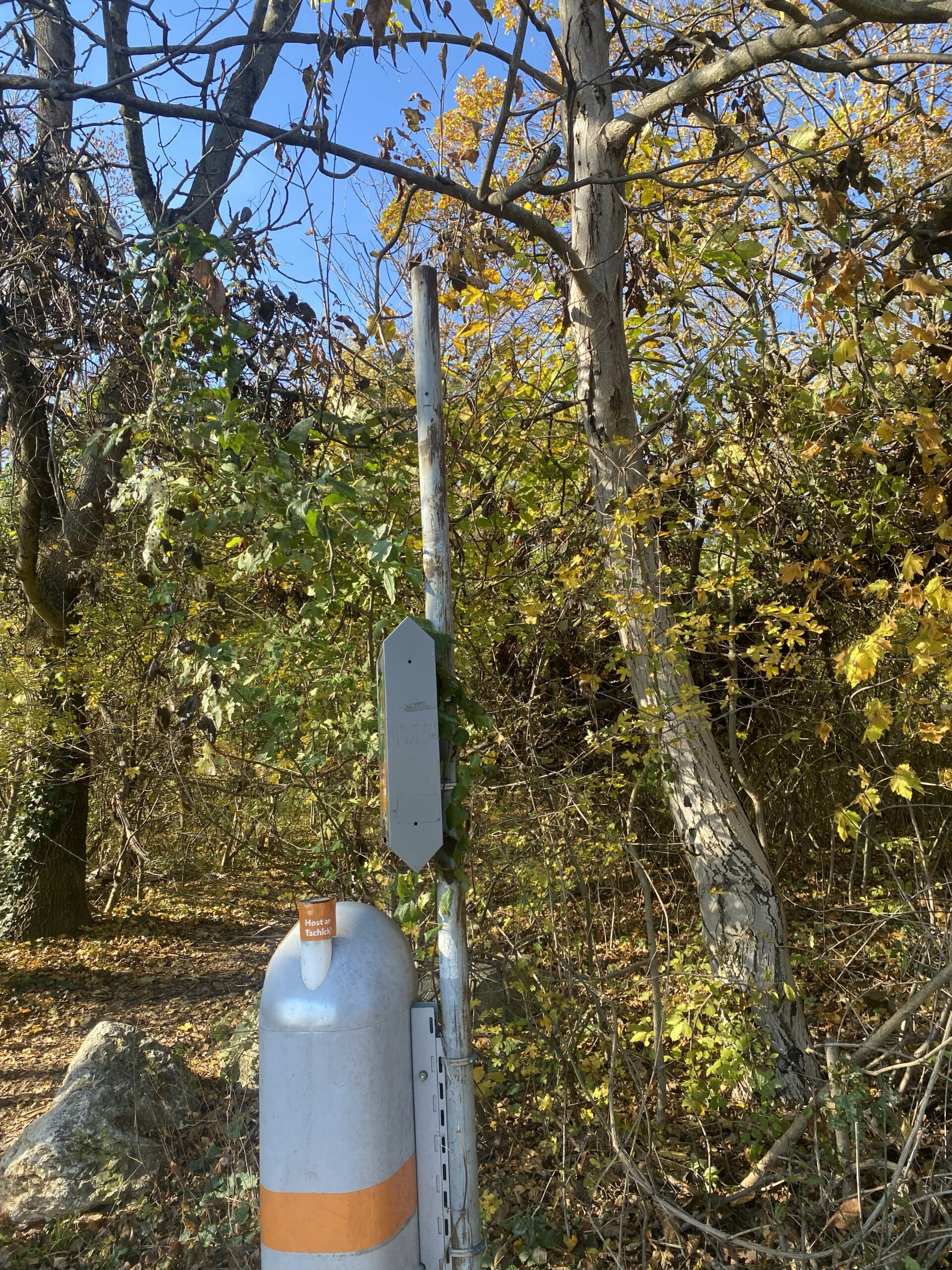 Dreht man sich nach rechts, sieht man den Eingang in den Wald, wo ein Mistkübel an einer Stange hängt. Schaut man die Stange genauer an, erkennt man ganz oben die Spuren einer früheren Tafel, wo stand: „Ruinengelände – Betreten verboten“. Das war in den sechziger Jahren der Lieblingsspielplatz vieler Baby­boomer, die in den Ruinen des ehemaligen Ba­rackenlagers der Luftnach­richten­truppe herumkletterten. Heute befindet sich dort nach wenigen Metern der große Parkplatz – einst der Kasernenplatz, der von Holz­ba­racken umgeben war.