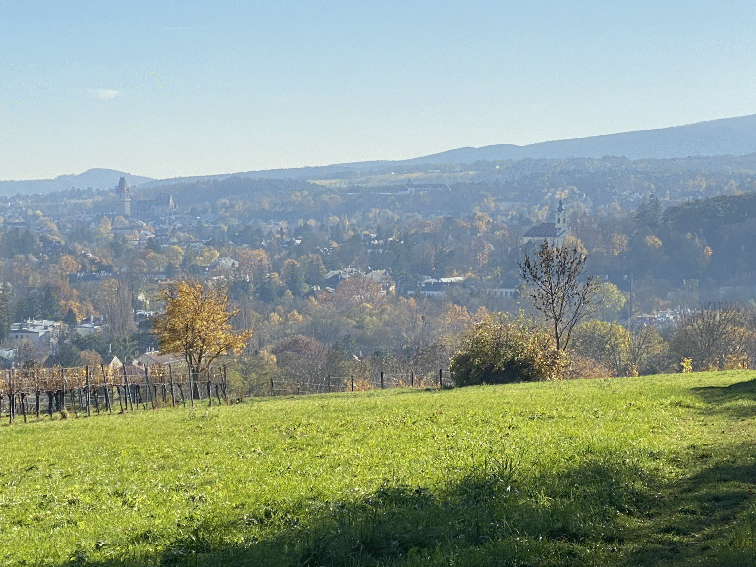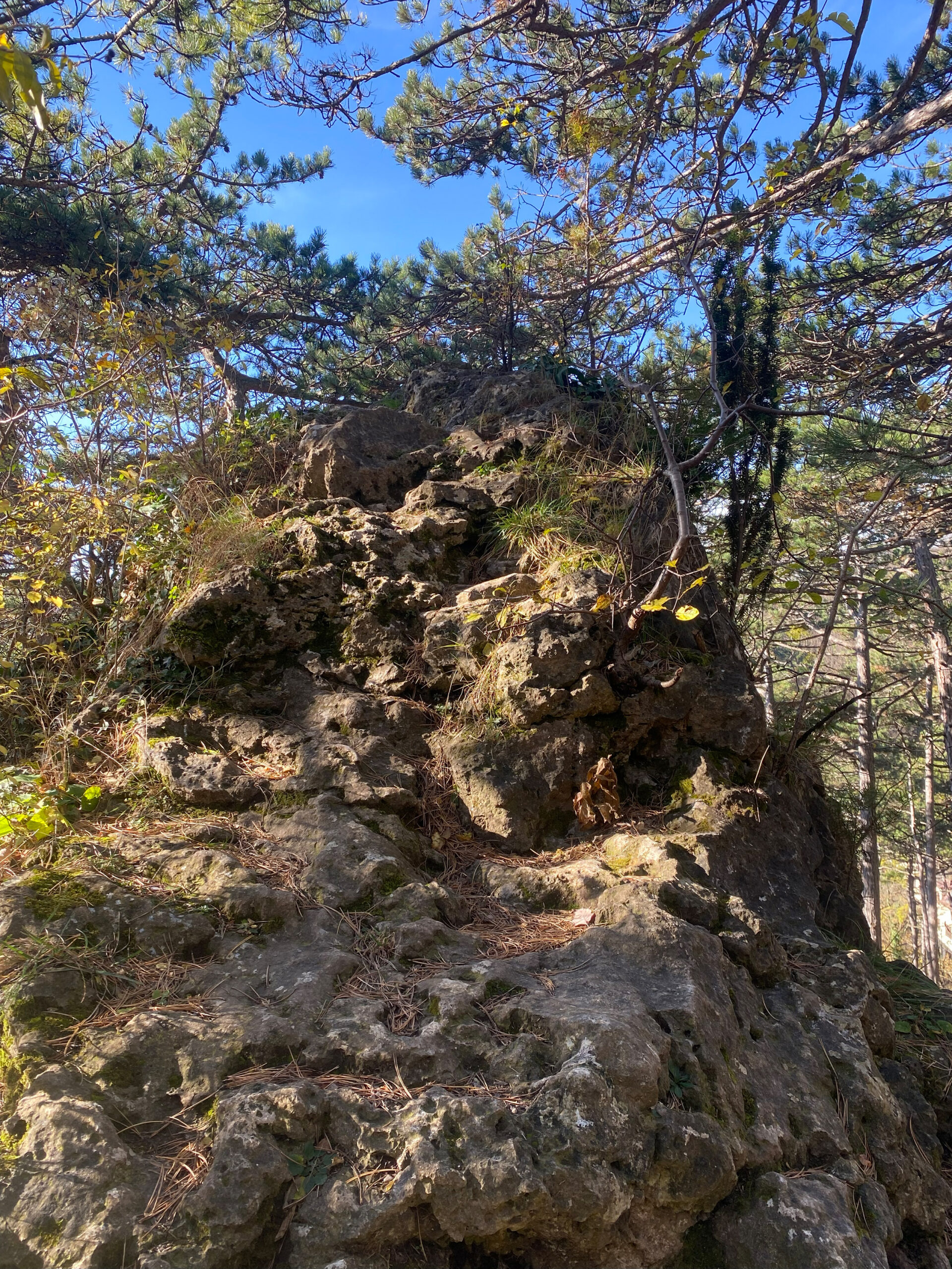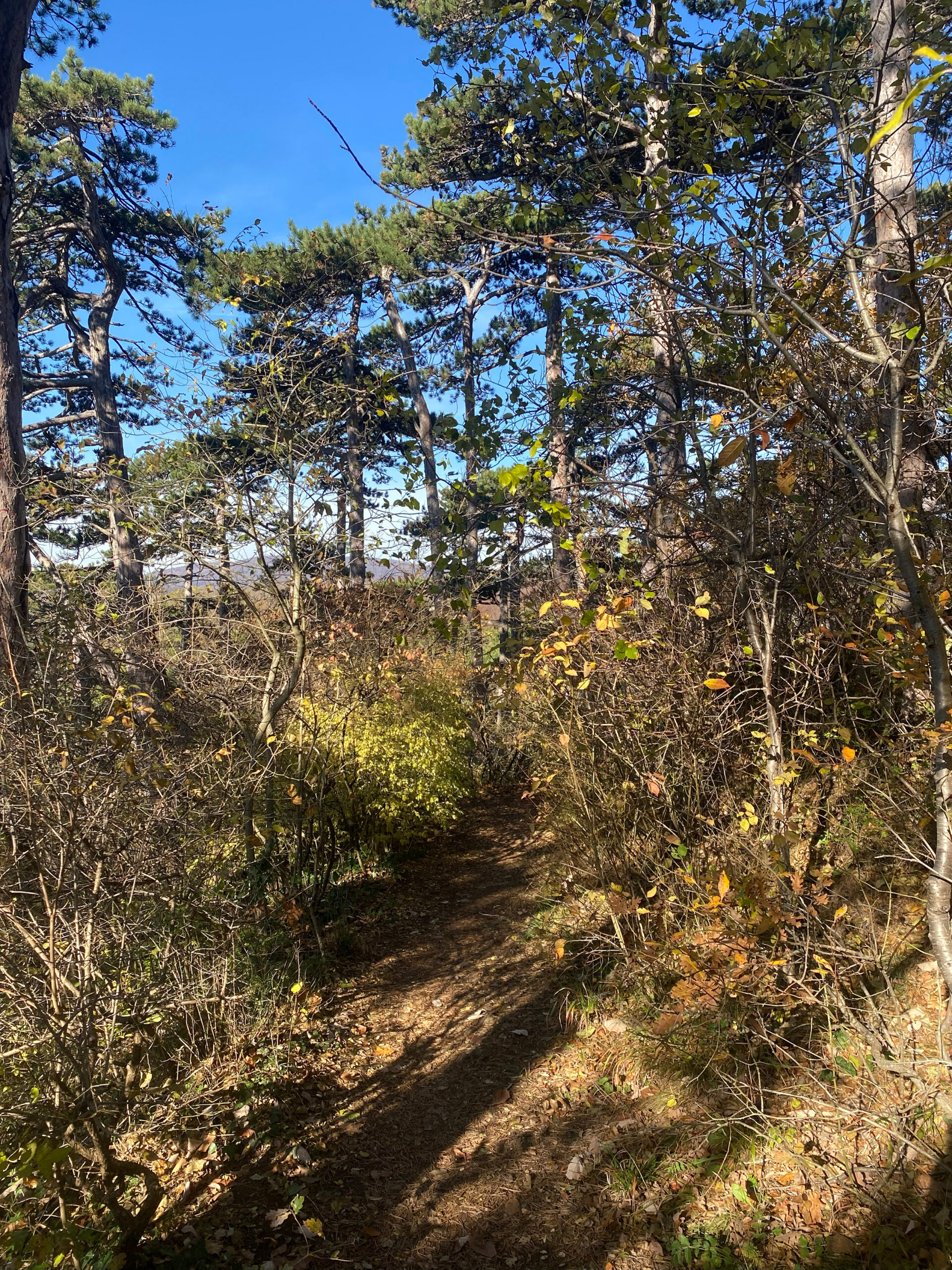 Doch schon bald erinnert die Landschaft wieder ans Meer: Der Weg führt parallel zur ehemaligen Durchzugsstraße In der Klausen zur Himmelswiese. Hier fallen die prächtigen Föhren auf. Wie Hans Steiner in seinem Buch „Föhrenberge“ erklärt, bildete sich im Gebiet In der Klausen Kalkstein – idealer Boden für Föhren. Nördlich davon entstand Sandstein, auf dem der typische Mischwald des Wienerwaldes gedeiht, der rund vier Fünftel seiner Fläche ausmacht. Oben angekommen, genießt man nicht nur den herrlichen Blick auf Kalks­burg (Kalk!), sondern kann über einen wunderschönen Ser­pen­tinenweg durch den Föhren­wald Richtung Klausen absteigen.