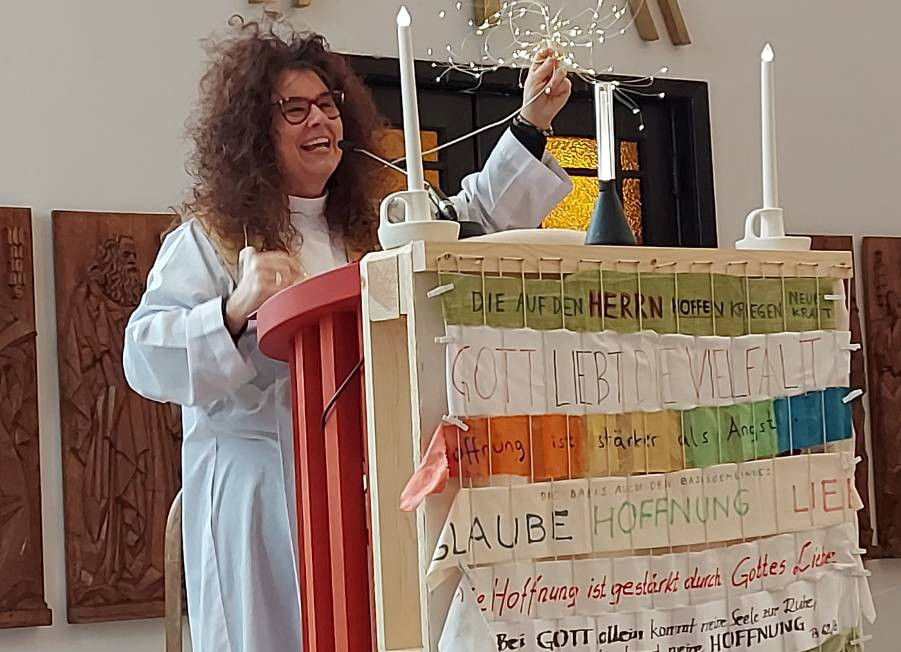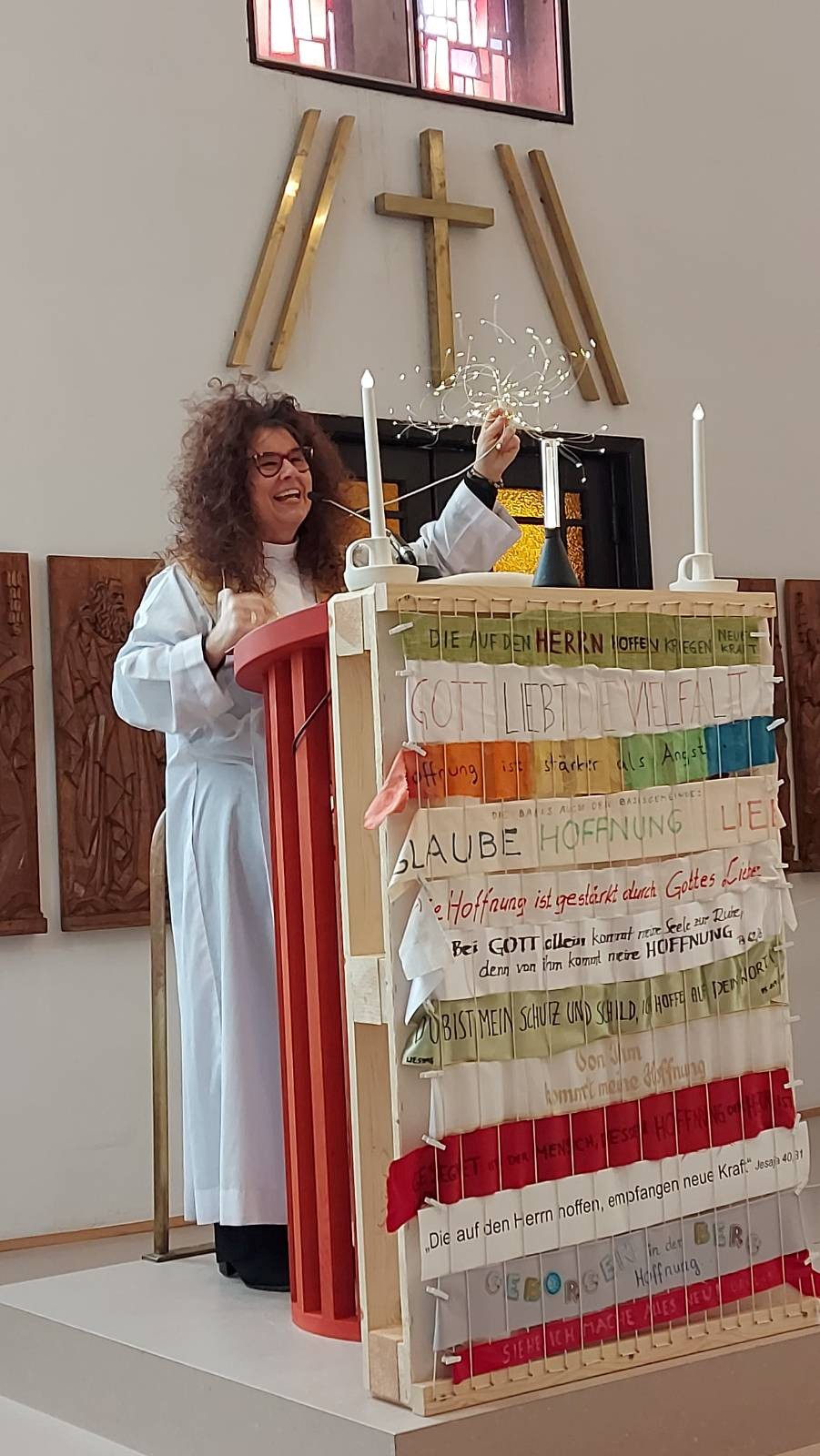 Bei der Lesung (Epheserbrief 4,1-13) ging es um Einheit, Pastoralassistentin Alex Kommer brachte in ihrer exzellenten Predigt eine sehr persönliche Geschichte zum Thema Einheit der Kirchen. Anschließend baute sie auch das schwierige Johannesevangelium (Joh 12,31-36) ein, bei dem es um Licht und Finsternis ging. Sie verwendete dabei Lichter auf eine sehr eindrucksvolle Weise, wie man anhand des Fotos sehen kann.