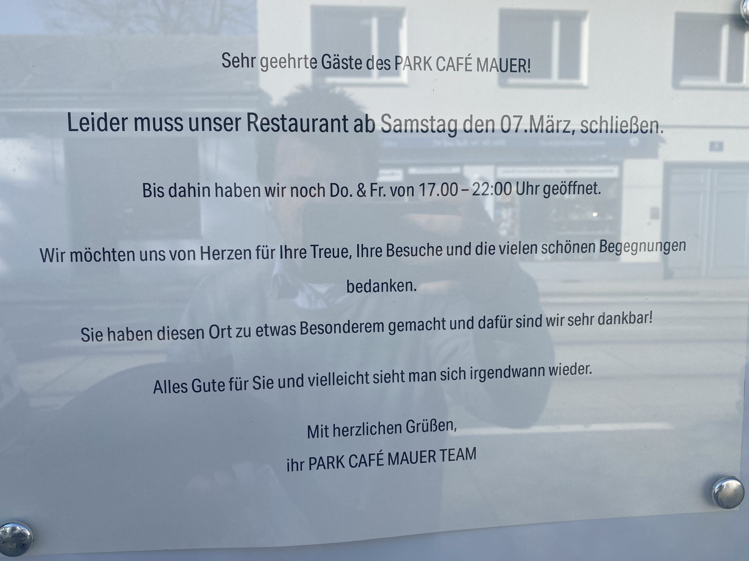 Die Freude war groß in Mauer, als letzten Herbs das Park-Café wieder eröffnet wurde. Euphorisch wurde das neue Konzept in den Gastro.News gefeiert. Lesen Sie dazu  hier. Nun wird ebenfalls von Gastro.News das Traurige verkündet.