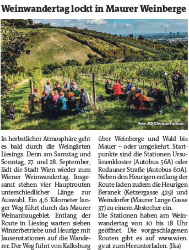 Es ist Dipl. Ing. Hans Mittheisz zu verdanken, dass man im Rahmen der Wiener Weinwandertage nun auch in Mauer wandern kann: Es hat einige Jahre gedauert, bis er die Maurer Route in die Weinwanderwege fix etablieren konnte. Umso erfreulicher ist nun der Artikel in der aktuellen Bezirkszeitung. Wenn man dort erwähnt wird, hat man es wirklich geschafft: